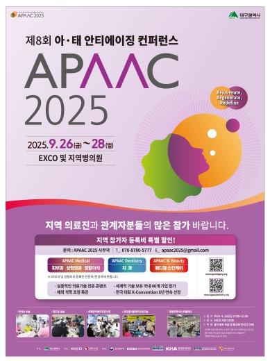 ‘2025 제8회 아태 안티에이징 컨퍼런스(APAAC 2025)’가 9월 26일부터 28일 3일간, 대구 엑스코와 대구경북첨단의료복합단지(첨복재단), 지역 병의원에서 열린다. 대구광역시가 주최하고, 아태안티에이징학