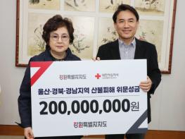 김진태 강원특별자치도지사는 4월 2일, 11시 강원자치도청 통상 상담실에서 대형 산불 발생으로 큰 피해를 입은 울산・경북・경남 지역의 피해 복구를 위해 구호 성금 2억 원을 대한적십자사를 통해 지정 기