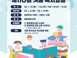 세종특별자치시 종촌동도서관이 오는 13일부터 16일까지 초등학생 1~3학년 학생을 대상으로 ‘2025년 전국 도서관 겨울 독서교실’을 운영한다.독서교실은 책을 통한 어린이들의 창의·융합적 사고력 향상을