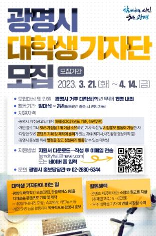 [신문솔루션, 브레인기자] 광명시는 젊은 세대의 상상력과 참신한 아이디어를 바탕으로 SNS 등을 활용하여 적극적으로 시정을 홍보하기 위해 광명시 대학생기자단을 오는 21일부터 4월 14일까지 모집한다.