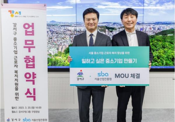 김태우 서울 강서구청장은 20일 오후 4시 구청장실에서 김현우 서울산업진흥원 대표이사와 ‘중소기업 근로자 복지 향상을 위한 업무협약’을 체결했다.