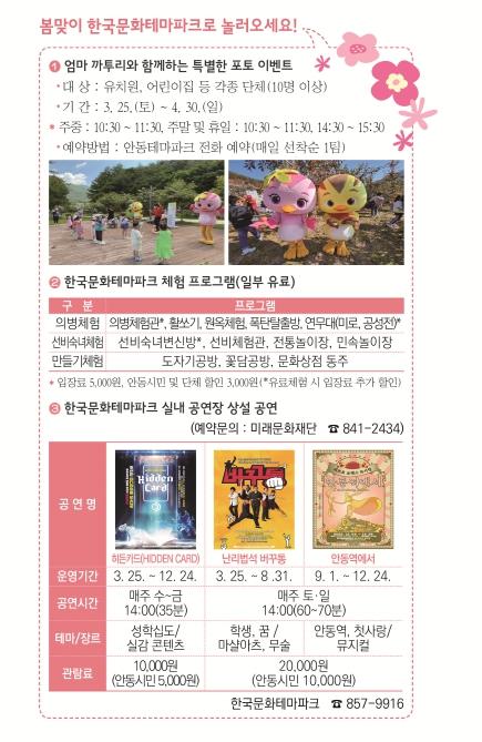 안동시 관계자는 “엄마까투리 4남매와 함께하는 다양한 체험 이벤트와 재미있는 상설공연과 함께 볼거리와 놀거리가 풍부한 한국문화테마파크에서 새봄의 향기를 만끽할 수 있을 것”이라 기대하며, “앞으로도 관광객의 수요에 맞춘 다양한 프로그램과 스토리를 채워 나갈 것”이라고 밝혔다.