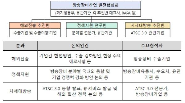 ?방송장비산업 발전협의회?는 추진 목표에 따라 전문분야별(?해외진출, ?정책지원, ?차세대방송) 3개 분과로 구성하고 산·학·연·관 각 분야 전문가가 참여하는 형태로 운영된다.