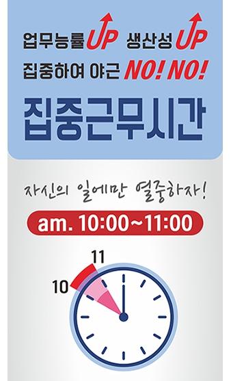 집중근무시간제는 업무 집중도가 가장 높은 시간대에 업무 외적인 요소에 방해받지 않고 밀도 있게 일함으로써 업무 효율성을 극대화하기 위해 추진하게 됐다. 집중근무시간제는 업무의 몰입을 높여 관행적인 초과근무를 줄임으로써 일과 가정의 양립 확산과 “일할 때 집중적으로 일하고, 쉴 때 제대로 쉬는” 근무 문화를 정착하기로 했다.