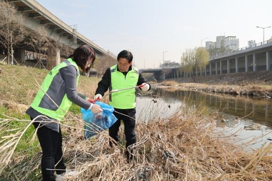 박강수 구청장과 동 자원봉사캠프장을 비롯한 활동가 50여명은 함께 EM(유용미생물) 흙공을 던지고, 플로깅(조깅하며 쓰레기 줍기)을 하며 정화활동을 펼쳤다.