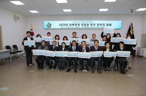 [신문솔루션, 브레인기자] 민주평화통일자문회의 부산중구협의회는 지난 3월 20일 중구청 중회의실에서 자문위원 및 관계자 30여 명이 참석한 가운데 ‘2023년 남북관계 전망과 한국정부의 과제’라는 주제로 2023년 1분기 정기회의를 개최했다. 그리고 정기회의 후 ‘2030부산세계박람회’ 유치를 기원하는 손 피켓 퍼포먼스를 실시했다.