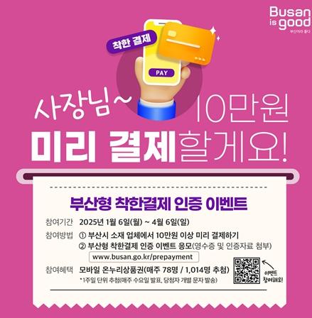 '부산형 착한결제 캠페인'은 인근 가게에서 미리 결제하고 재방문을 약속해 소상공인의 경영 안정과 지역경제 활성화를 도모하는 상생형 소비 캠페인으로, 민간기업과 시민의 자발적 참여를 유도해 소비 촉진을 일으켜, 지역경제 활력 제고를 목표로 한다.