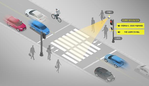 횡단보도를 건너려는 보행자가 안전지역을 벗어나 무단횡단을 시도하면 “위험하오니 인도로 이동하세요.”라는 음성 메시지로 위험을 알려주고, 녹색신호 잔여 시간이 보행자가 건너야 할 거리에 비해 부족한 경우에는 “다음 신호에 건너세요.”라는 음성 안내를 내보낸다.