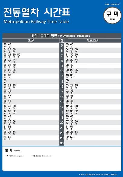 대형 전동열차로 구미-칠곡-대구-경산 전 구간을 1시간 이내로 하루에 최대 왕복 100회 정도(평일 기준) 운행하며, 아직 개통 초기이기 때문에 향후 이용수요, 선로 용량, 보유 차량 등 한정된 자원의 효율적인 운영을 위해 다양한 제반 사항을 고려한다.