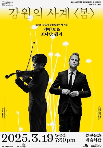 [신문솔루션, 브레인기자] 강원특별자치도는 ‘2025~2026 강원 방문의 해’를 맞아, 세계적인 바이올리니스트 양인모와 함께하는 ‘양인모 & 조나단 웨어 듀오 리사이틀’을 3월 19일 오후 7시 30분 춘천문화예술회관에서 개최한다. 본 공연은 ‘강원의 사계’라는 테마로 진행되는 첫 번째 공연으로, 봄을 맞아 클래식 음악의 아름다움을 선사할 예정이다.