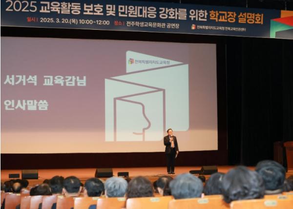 [신문솔루션, 브레인기자] 전북특별자치도교육청은 20일 전주학생교육문화관 공연장에서 교원의 안정적인 교육활동 지원 및 교육에 전념할 수 있는 여건 조성을 위한 학교장 설명회를 개최했다.