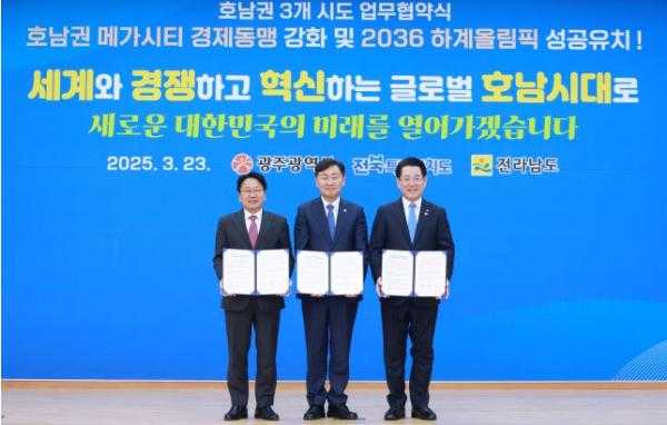 [신문솔루션, 브레인기자] 전북특별자치도와 전라남도, 광주광역시는 23일 나주시청 대회의실에서 3개 시도지사가 함께 모여 2036 전주하계올림픽 성공 유치 등 상호 협력을 통해 호남 지역 경제를 활성화 및 상생발전을 도모하기 위한 호남권 메가시티 경제동맹 강화를 위한 업무협약을 체결했다고 밝혔다.