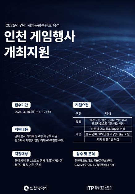 이 사업은 인천시가 추진하는 ‘인천 게임문화 콘텐츠 육성’의 일환으로, 인천에서 오프라인 게임 행사를 개최하는 기관·단체에 개최 비용을 1.2억 원(기관당 4천만 원)까지 지원하는 내용이다.