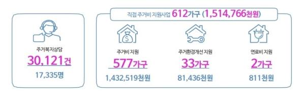 주거복지센터는 2024년까지 총 30,121건의 주거복지 상담과 총 612가구에 약 15억 원의 주거비와 주거 환경개선을 지원하여 도내 주거복지 사각지대 해소 및 주거 취약계층의 주거 안정에 기여했다.