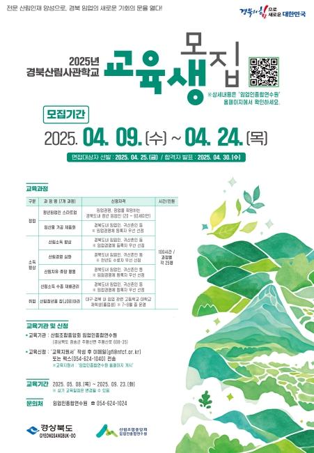 [신문솔루션, 브레인기자] 경상북도는 9일부터 16일간 경북 임산업 경쟁력을 높이고 산촌 경제 활력을 주도할 2025년 경북산림사관학교 교육생 175명을 모집한다.