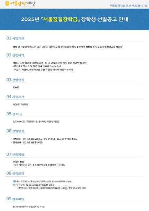 신청은 개인이 아닌 해당 학교 장학 담당자를 통해서만 가능하며, 접수는 4월 9일부터 23일까지 서울장학재단 누리집을 통해 진행된다. 최종 선발 결과는 5월 중 발표 예정이다.