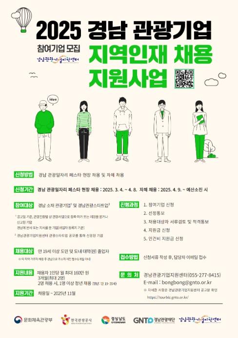 한편, 4월 9일부터 자체 채용 참여기업 모집이 시작되며, 자세한 내용은 경남관광기업지원센터 누리집 공고문을 통해 확인할 수 있다.