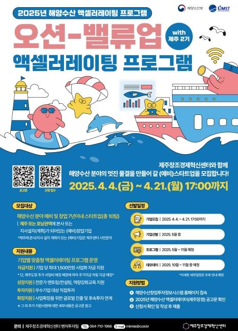 [신문솔루션, 브레인기자] 제주창조경제혁신센터는 2025년 4월 4일부터 4월 21일 오후 5시까지 해양수산 분야의 예비창업자 및 창업 7년 이내 기업을 대상으로 '오션-밸류업 with jeju' 2기 참가기업 10개사를 모집한다고 밝혔다.
