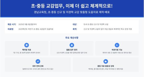 [신문솔루션, 브레인기자] 경상남도교육청은 오는 8일부터 도내 초·중등 교감의 업무 수행을 지원하기 위해 ‘2025학년도 하반기 초·중등 교감 업무 도움 자료’를 제작하여 배포한다.