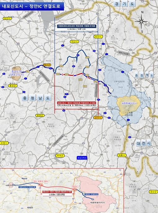 내포신도시~정안IC 연결도로 건설 사업은 2020년 5월 행복청의 ‘행복도시 광역교통 개선 대책(3차)’에 반영됐으나 2020년 6월, 2021년 1월, 2025년 6월 시급성 부족 및 혁신도시 공공기관 이전 미확정 등의 사유로 예타 대상에서 선정되지 못했다.