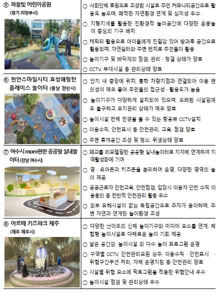 ‘우수 어린이놀이시설’은 어린이 안전에 대한 국민적 관심을 높이고 안전한 놀이시설 설치를 장려하기 위해 2012년부터 매년 선정해 왔으며, 지난해까지 총 109개소가 지정됐다.