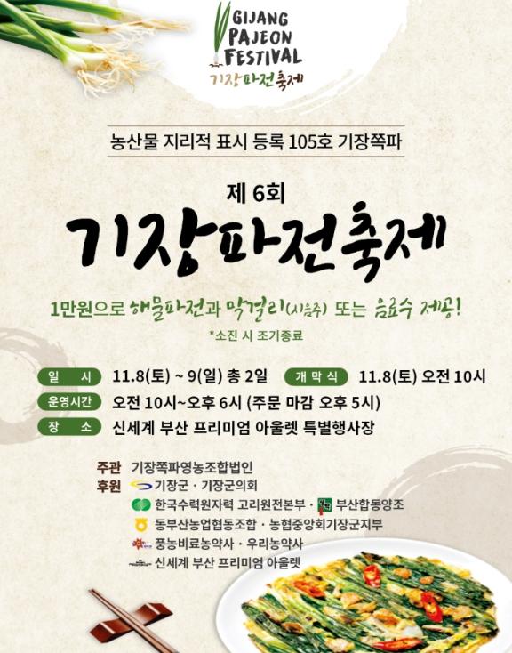 • [신문솔루션, 브레인기자] 기장군은 오는 8일부터 9일까지 2일간 신세계 부산 프리미엄 아울렛 주자창 부지 일원(장안읍 정관로 1133)에서 ‘제6회 기장파전 축제(기장쪽파·파전 홍보행사)’를 개최한다고 7일 밝혔다.