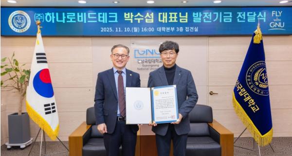 • [신문솔루션, 브레인기자] 경상국립대학교는 진주시 내동면에 위치한 ㈜하나로비드테크 박수섭 대표가 대학발전기금 1000만 원을 기부했다고 밝혔다.