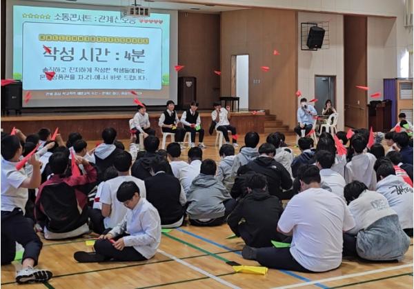‘소통 콘서트’는 전교생이 체육관에 모여 관계가 틀어진 경험과 관계 유지·증진을 위한 다짐을 색색의 종이에 적어 비행기로 날리며 서로의 감정을 공감하고 이해하는 시간을 가진 참여형 활동이었다.
