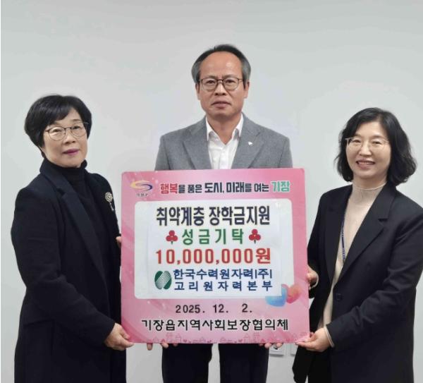 • [신문솔루션, 브레인기자] 기장군 행정복지센터는 지난 2일 ㈜한국수력원자력 고리원자력본부, 기장읍 지역사회보장협의체(민간위원장 권묘연)와 함께 지역 내 취약계층 학생을 위한 장학금 기탁식을 개최했다고 3일 밝혔다.