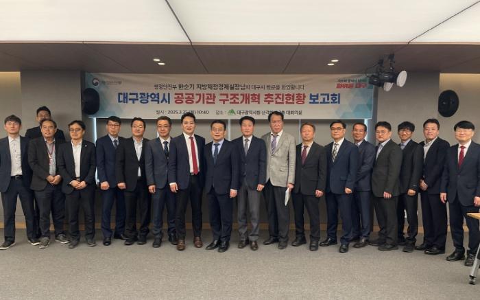 [신문솔루션, 브레인기자] 대구광역시는 25일 대구시청 산격청사 대회의실에서 한순기 행정안전부 지방재정경제실장이 참석한 가운데 ‘공공기관 구조개혁 추진현황 보고회’를 개최했다.